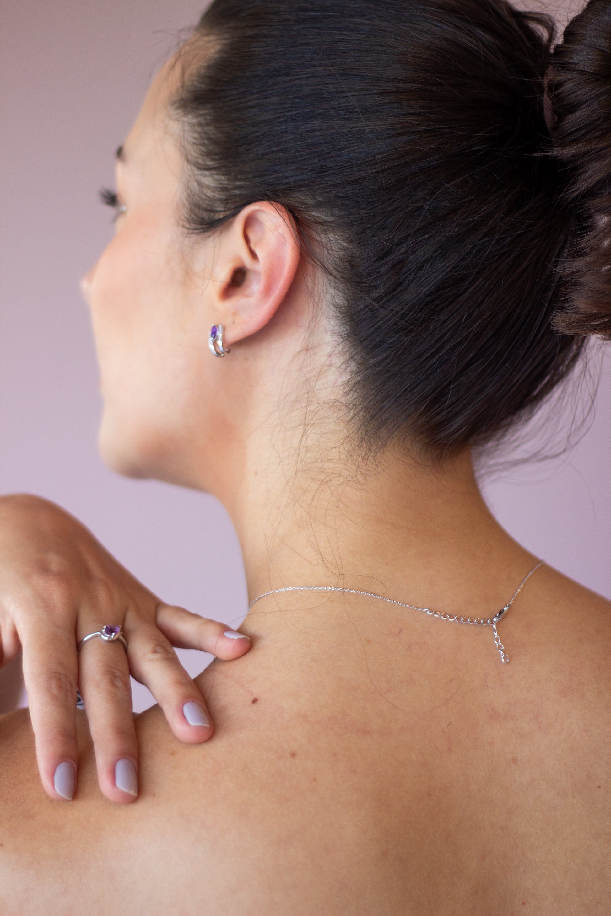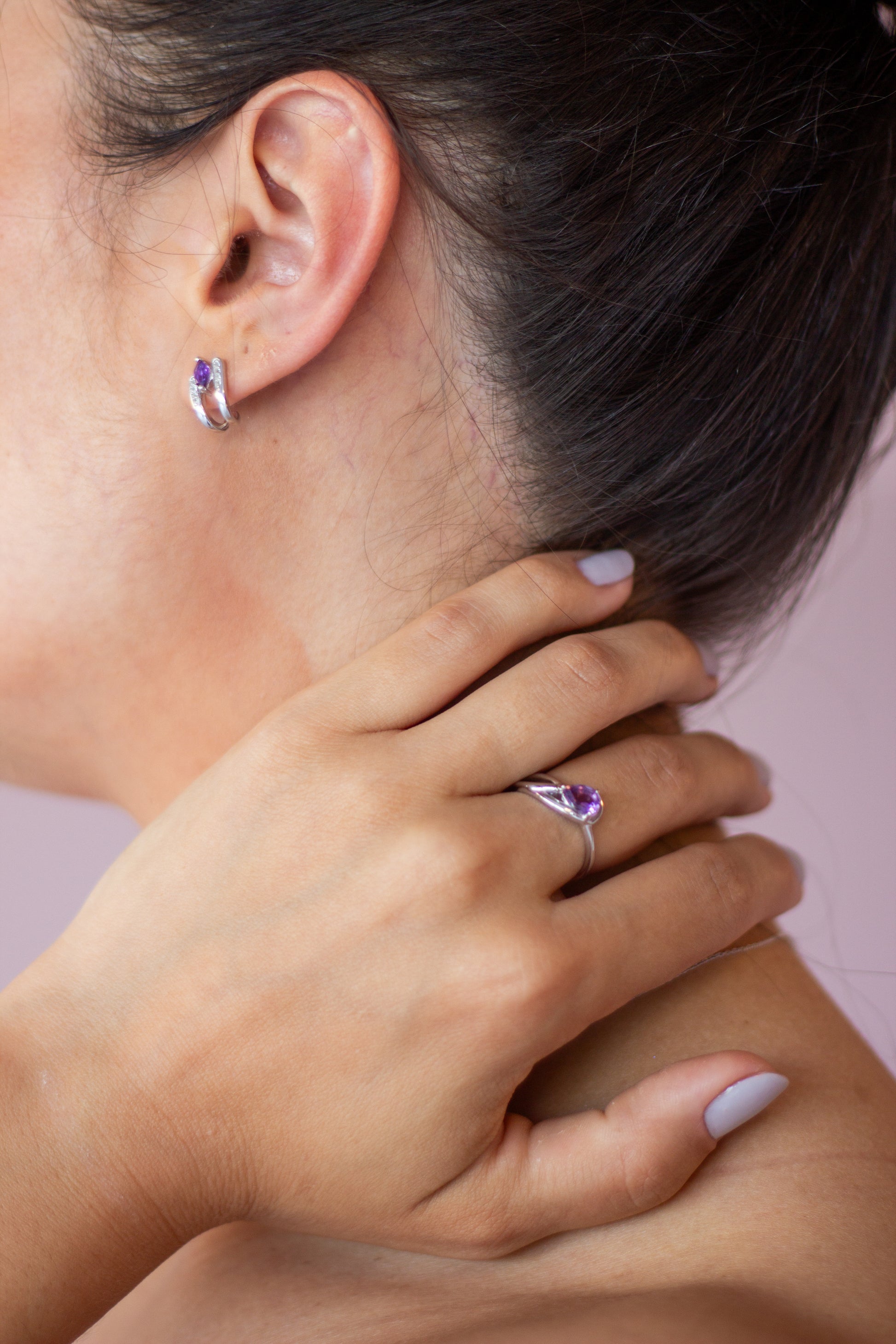 Este elegante brinco em prata 925 com banho de ródio revela o charme atemporal da ametista natural. Com 1,3 cm de altura e 0,9 cm de largura, seu design equilibra delicadeza e presença, oferecendo o destaque perfeito para qualquer ocasião.
