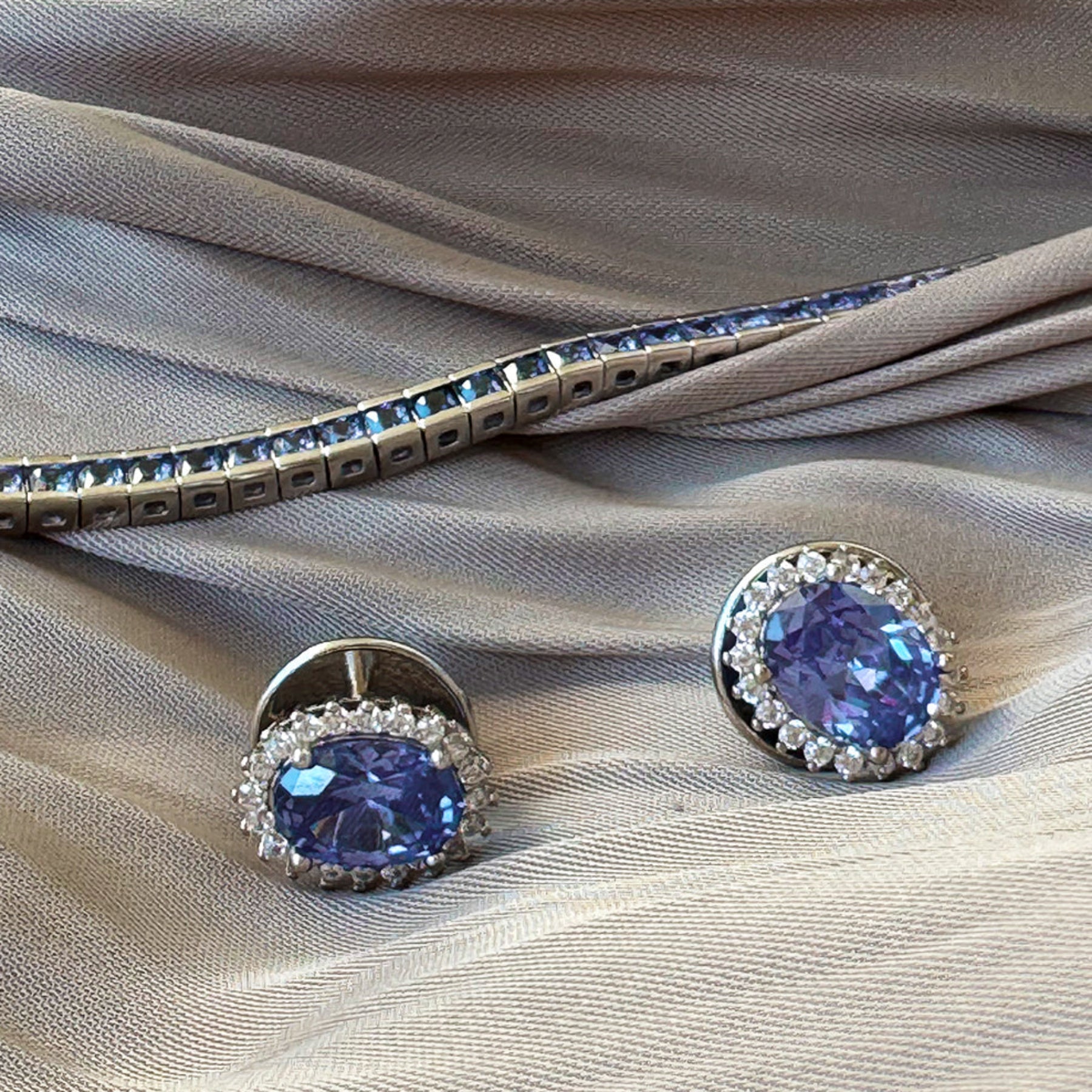 As zircônias utilizadas são pedras sintéticas de alta qualidade, com lapidação precisa e brilho intenso. A tonalidade tanzanita confere um toque de exclusividade, enquanto o contorno em zircônias brancas realça ainda mais a beleza da peça.
