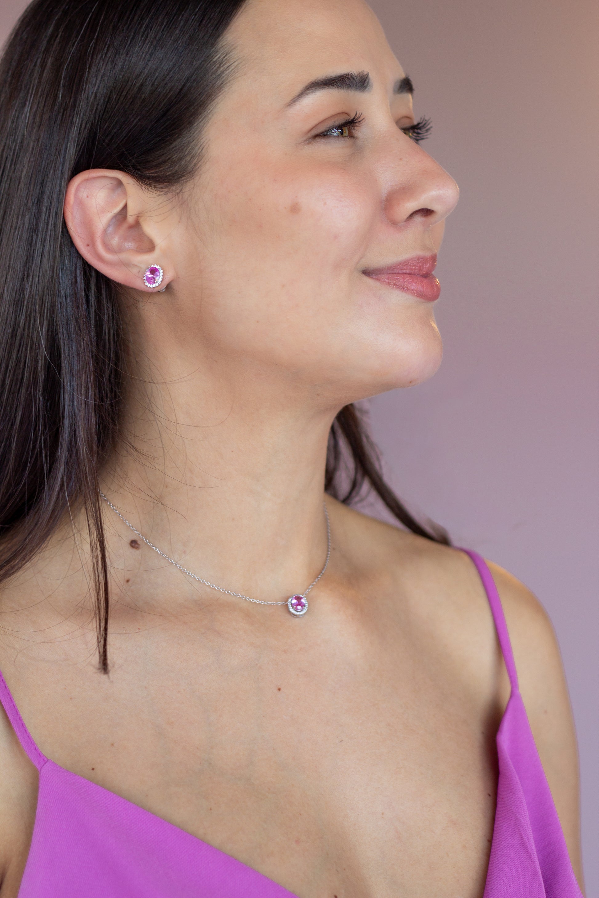 Este sofisticado brinco em prata 925 com banho de ródio combina o romantismo da zircônia pink com a elegância do design clássico. Ao centro, uma pedra oval na cor pink é rodeada por zircônias brancas que ampliam o brilho e trazem ainda mais destaque à composição.