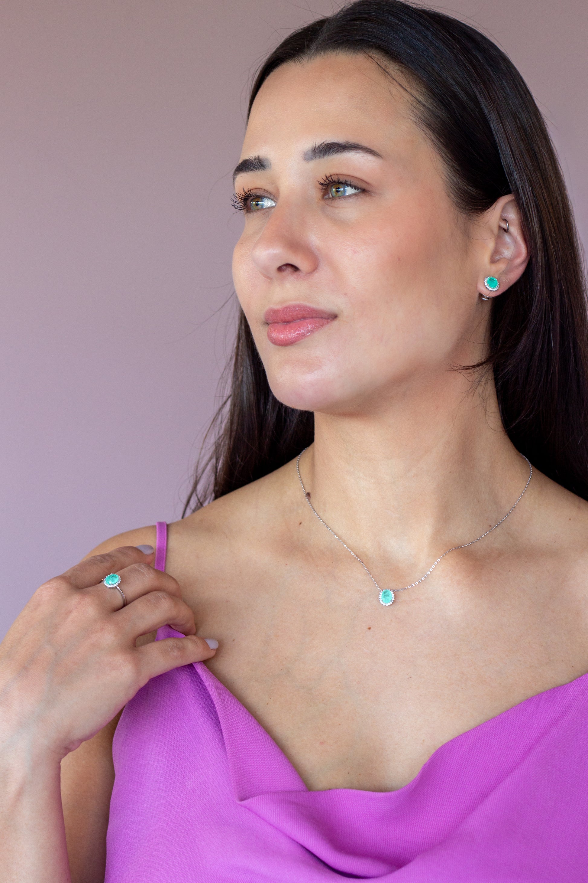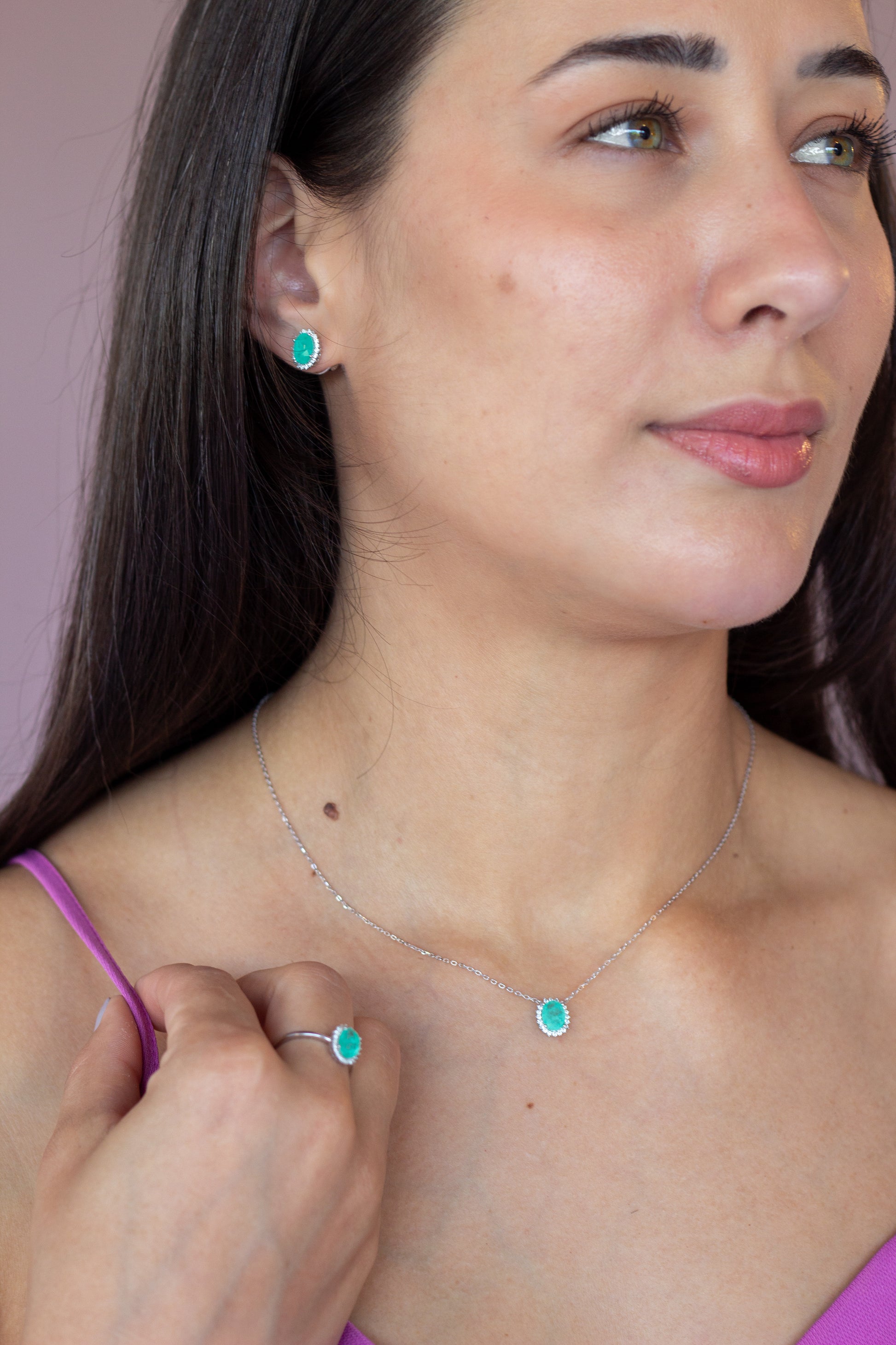 - Pedra central: Zircônia sintética na cor verde turmalina paraíba (lapidação oval)