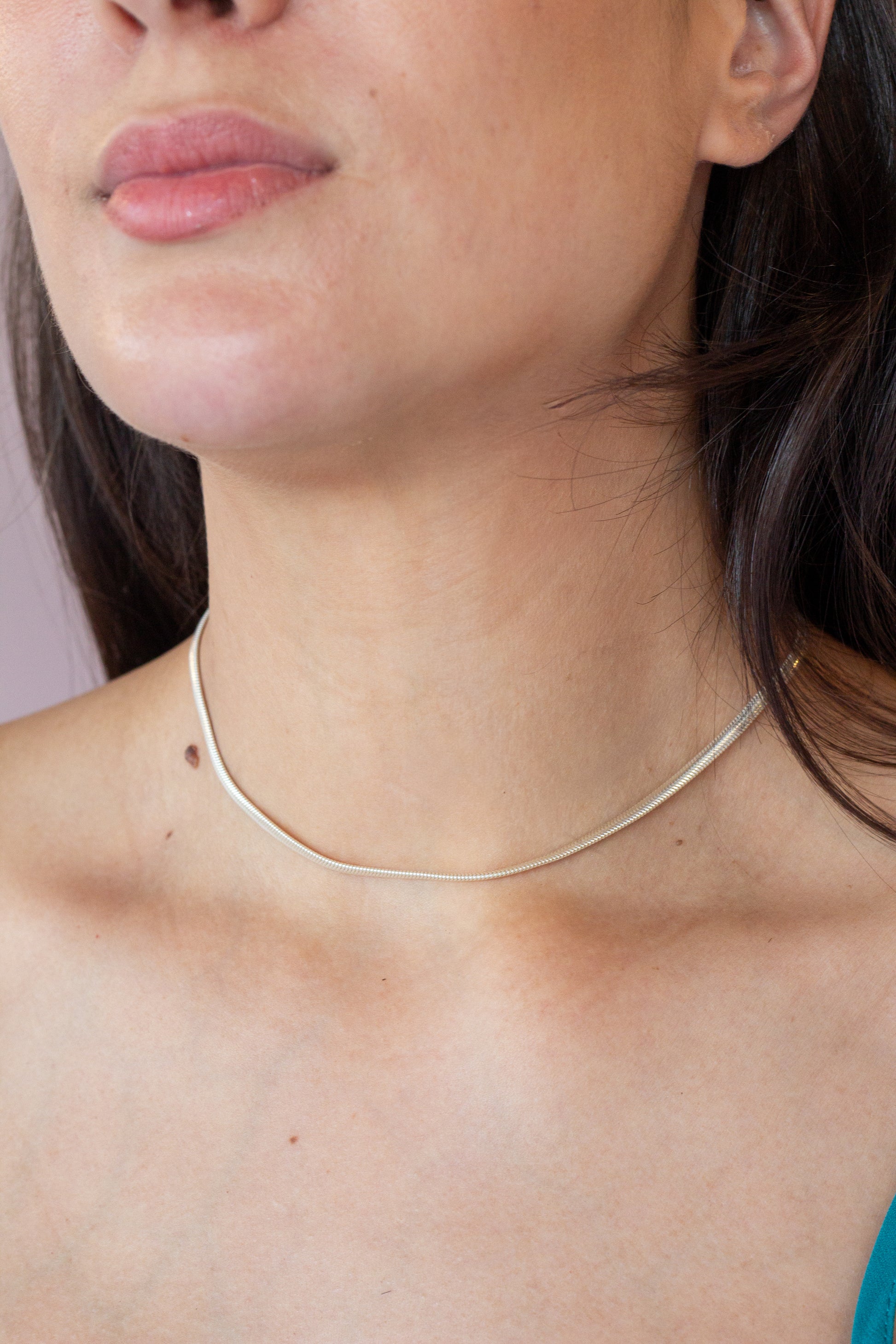 A malha tipo ômega é conhecida por sua estética elegante e estrutura suave, que se ajusta ao contorno do pescoço sem perder o formato. Seu brilho polido destaca o visual com sutileza e sofisticação.